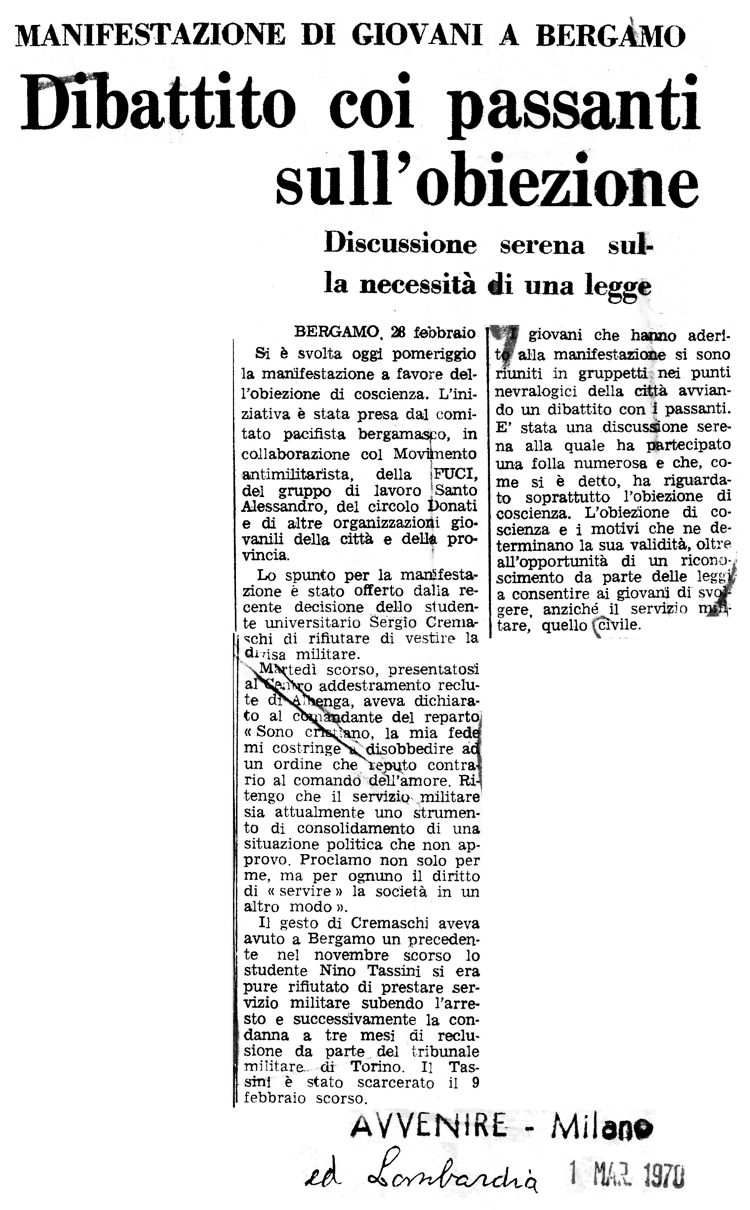 Manifestazione di giovani a Bergamo – Dibattito coi passanti sull’obiezione