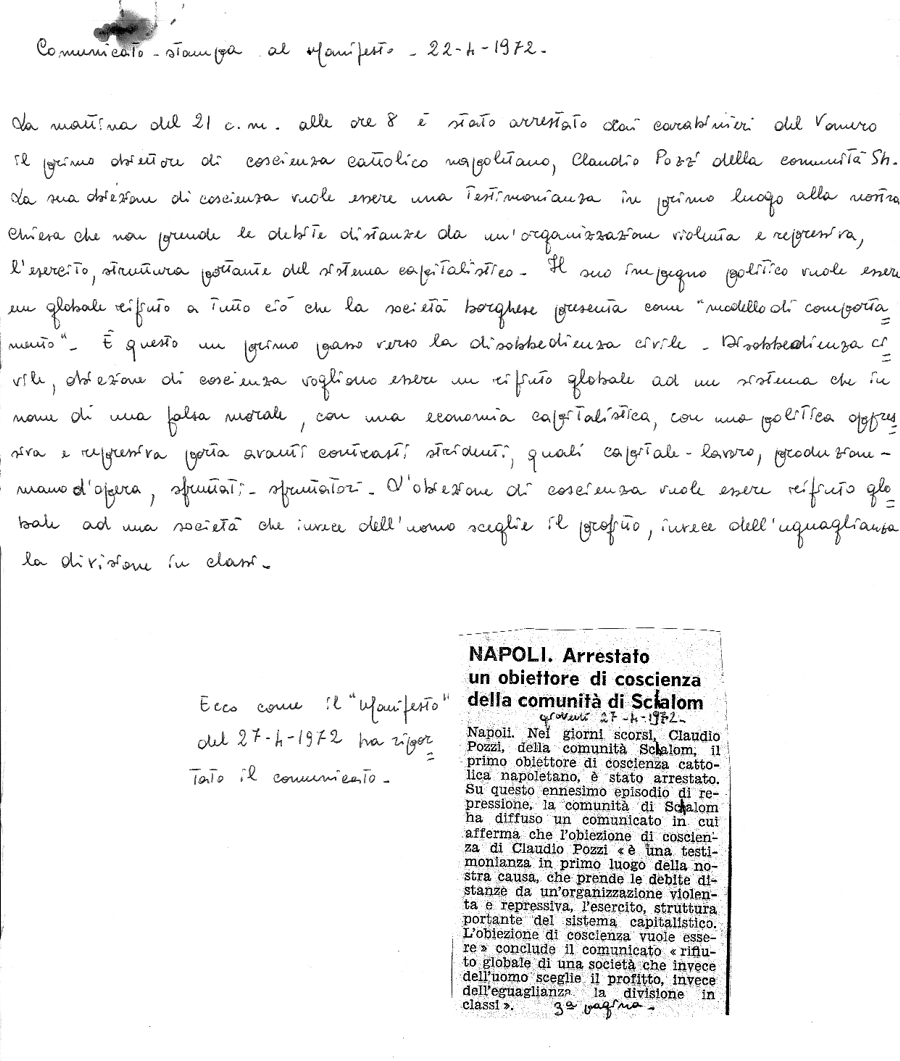 La maggior parte dei documenti riportano le notizie dei momenti intensi delle obiezioni di coscienza collettive, degli arresti che ne seguono e della manifestazioni. Eventi che con le loro risonanze porteranno in modo decisivo alla promulgazione della prima legge istitutiva del Servizio Civile n. 772 del dicembre 1972.