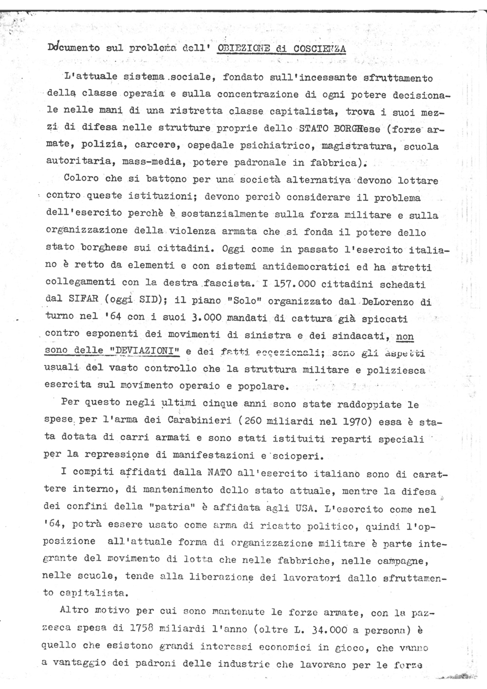 per informare sui risultati dell’iniziativa per l’obiezione di coscienza collettiva e sulle azioni comuni programmate nella riunione dei gruppi antimilitaristi tenuta a Bologna il 16 gennaio 1972.