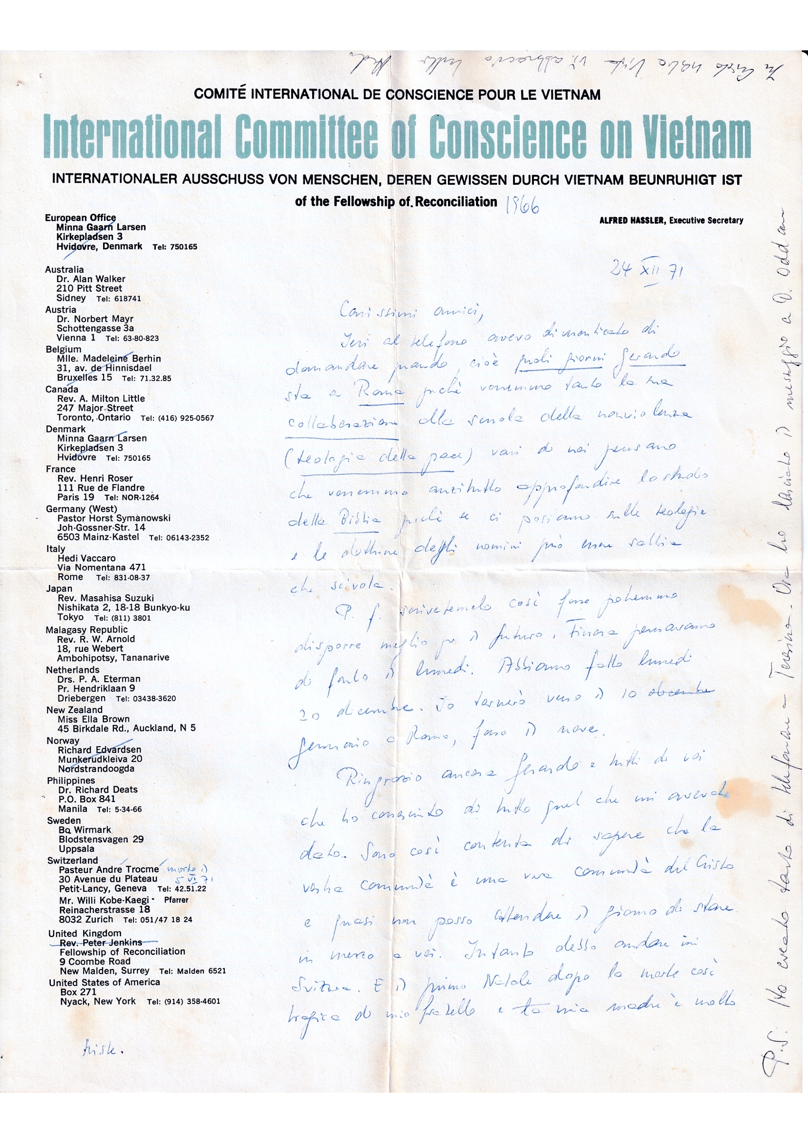 Hedi Vaccaro, durante il periodo dell’obiezione di coscienza di Claudio Pozzi, è stata molto vicina alla Comunità Shalom con visite, lettere o telefonate. Nel dicembre del 1971 aveva inviato questa lettera.